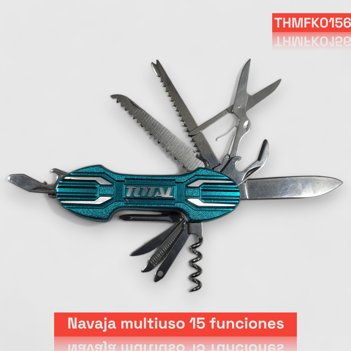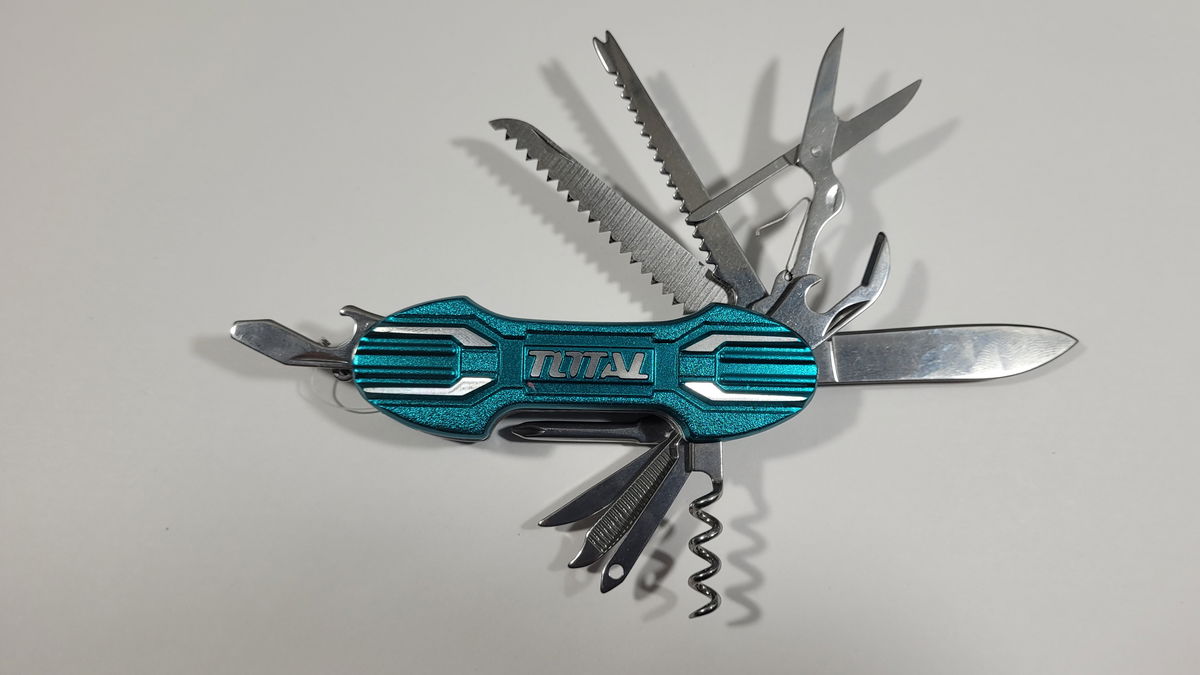 - Funciones integradas: cuchillo, destornillador, tijeras, sierra, abridor de botellas, abridor de vino, lima de uñas.